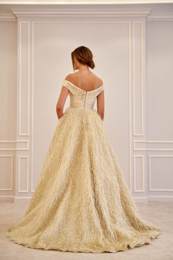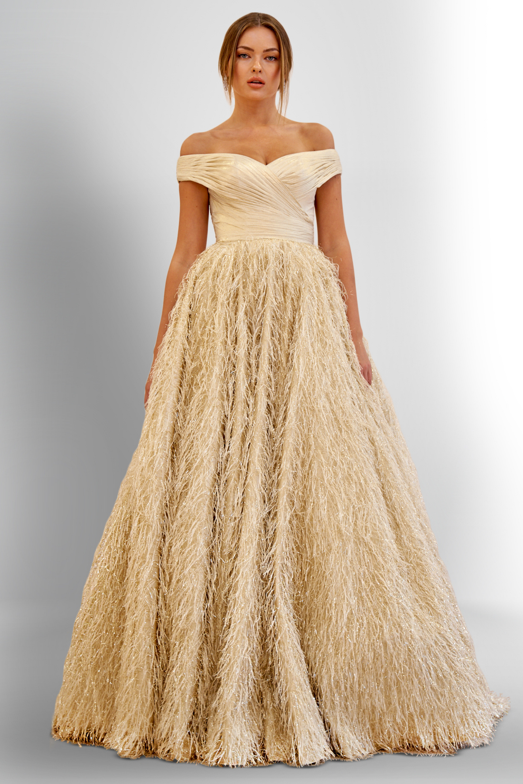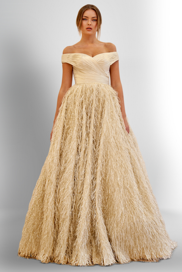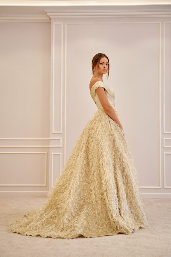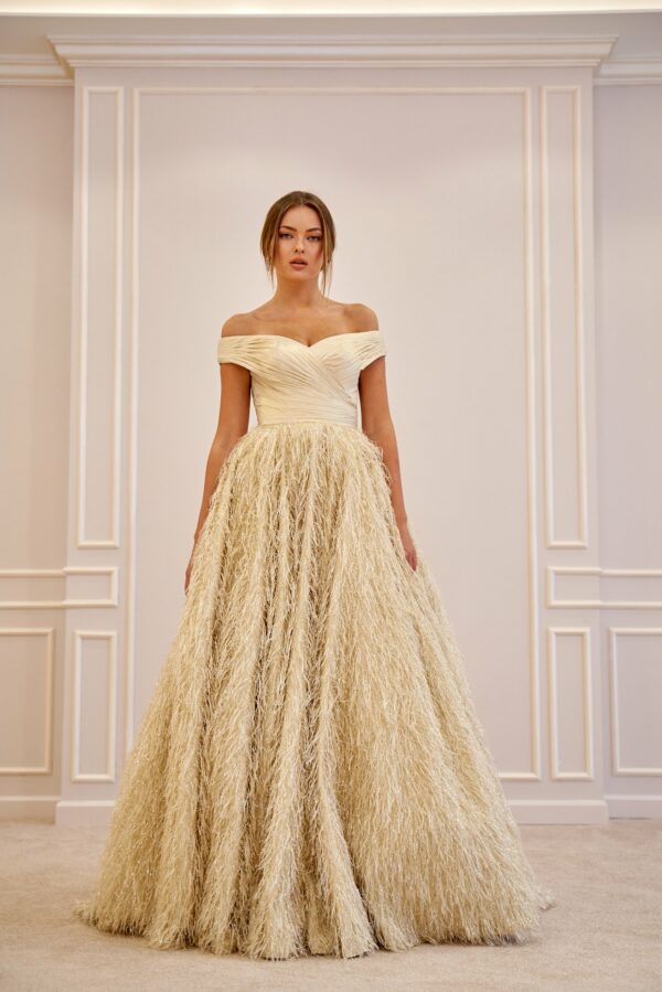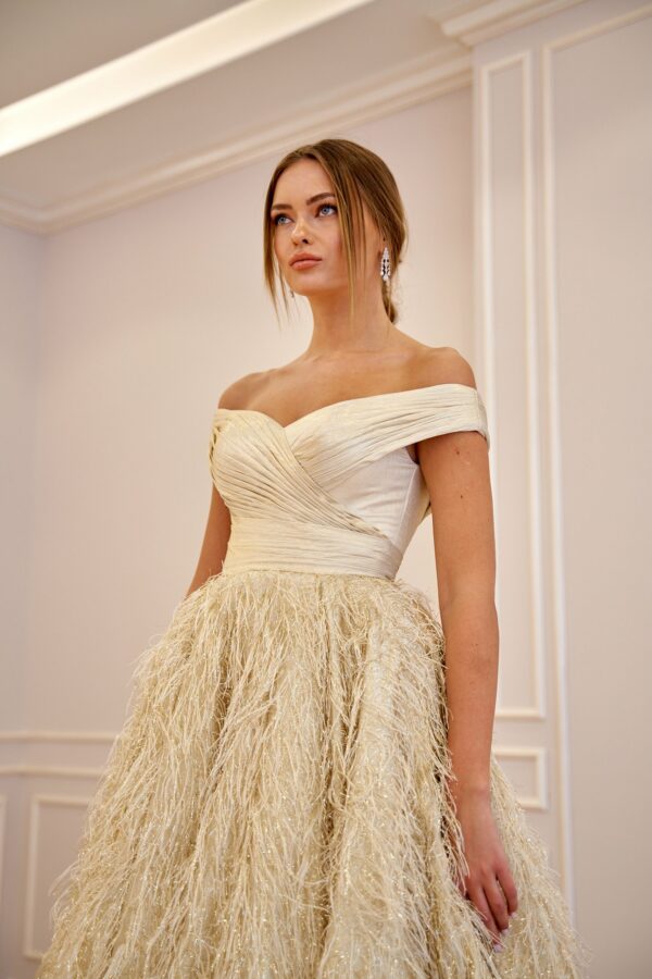 Own the spotlight in a Feathery Off-Shoulder Princess Gown tailored by a leading fashion designer in Abu Dhabi. Contact us today to start your couture journey.