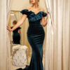 Make a bold statement in a Ruffled Off-Shoulder Velvet Mermaid Gown, designed in Abu Dhabi. Book your custom dress consultation today and stand out in style.