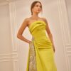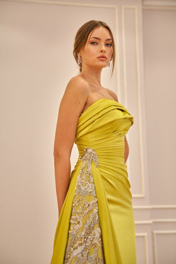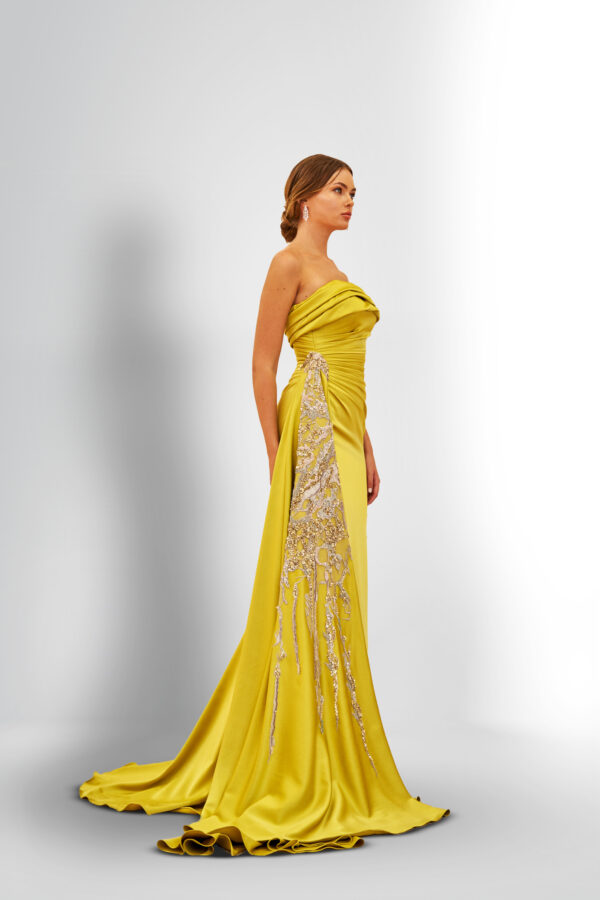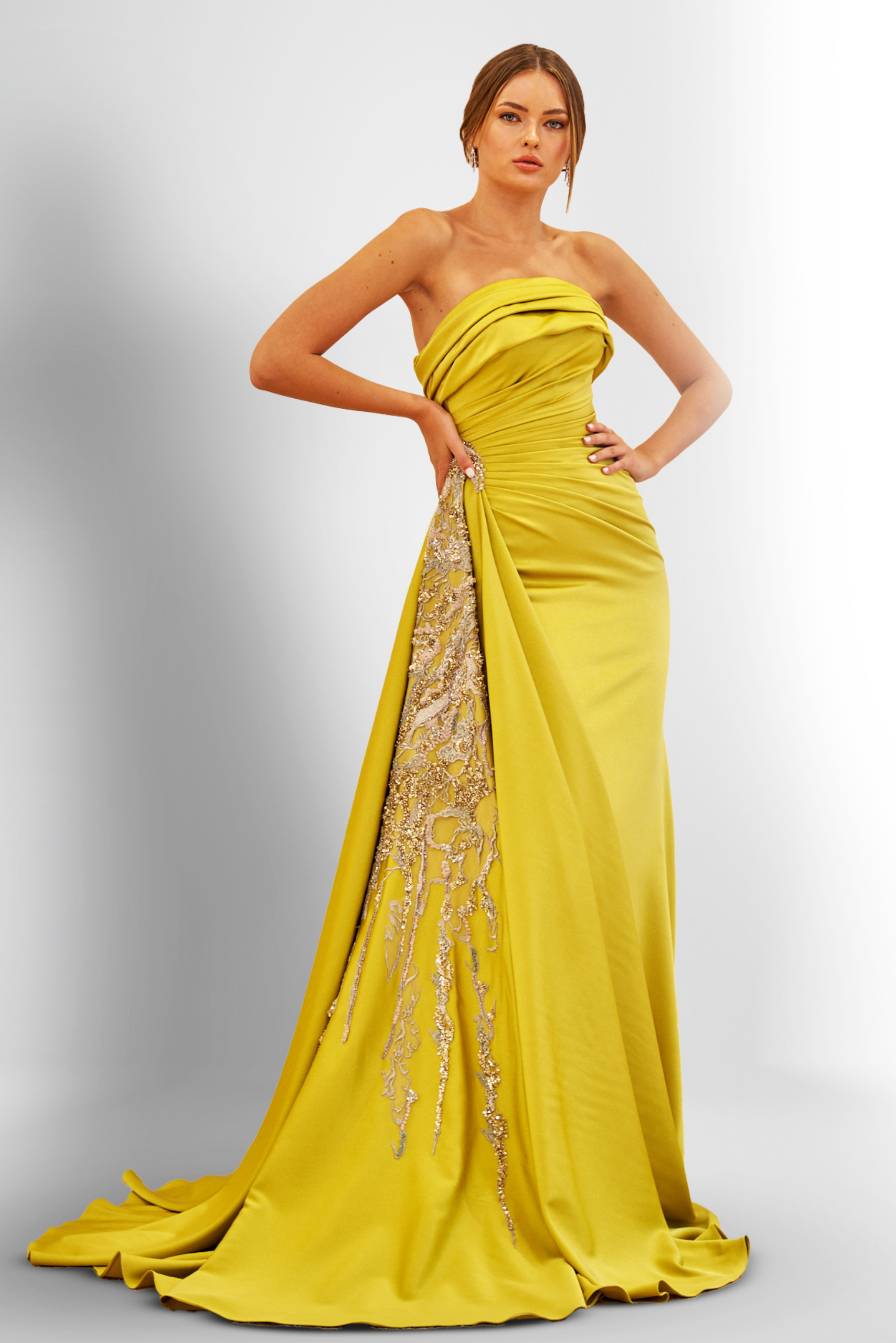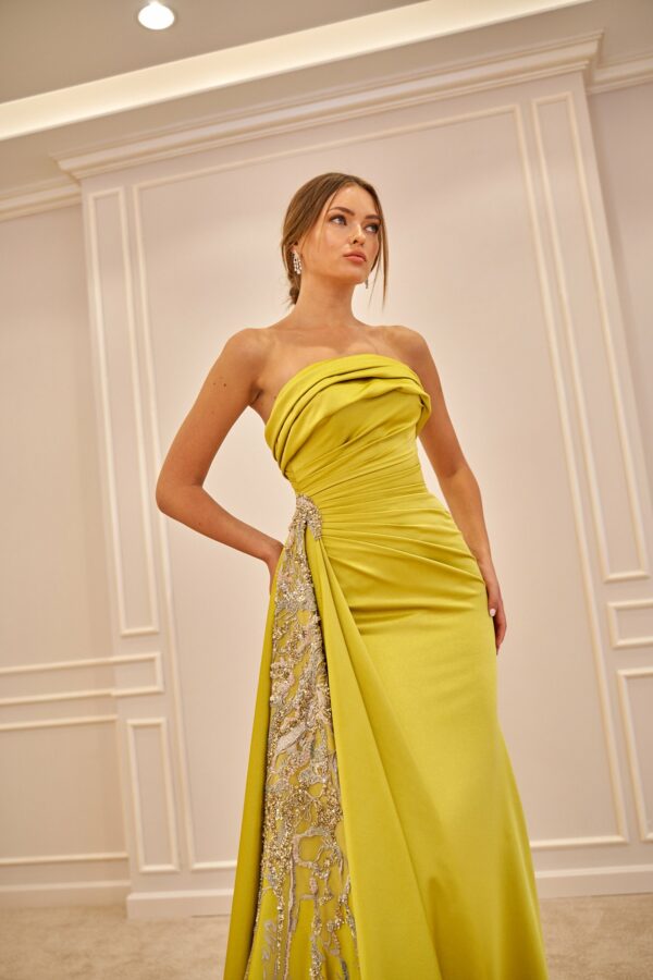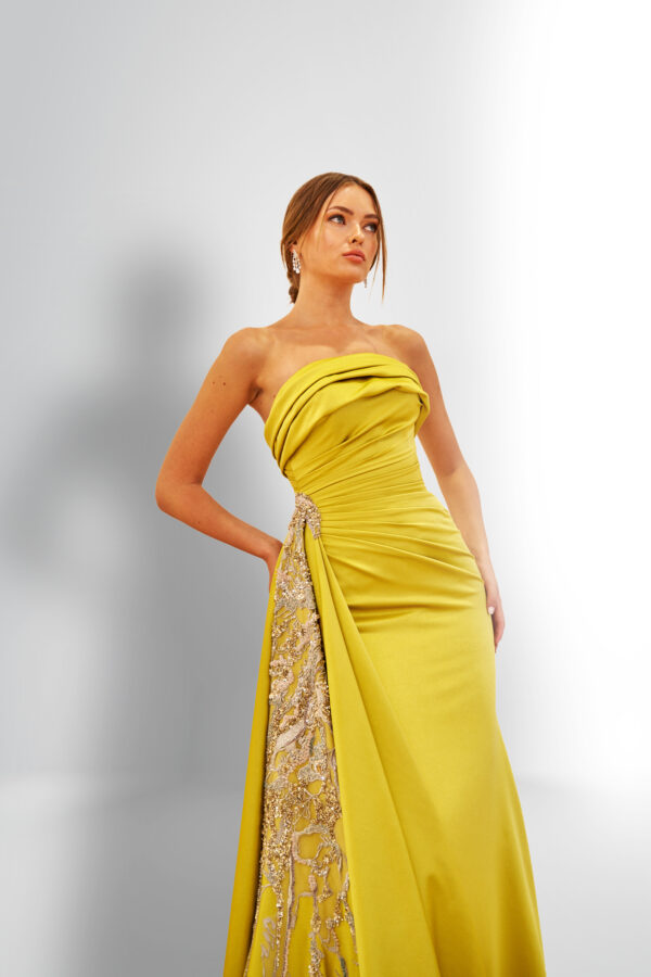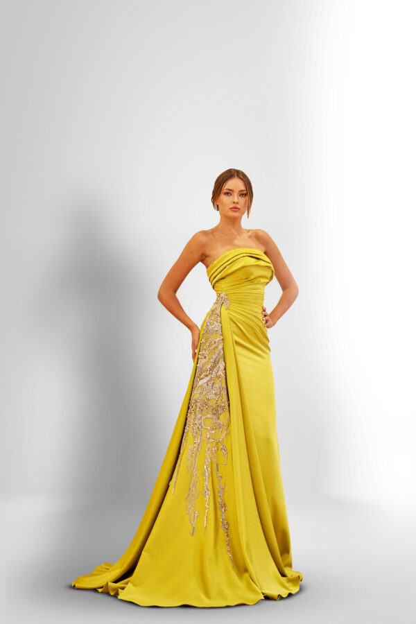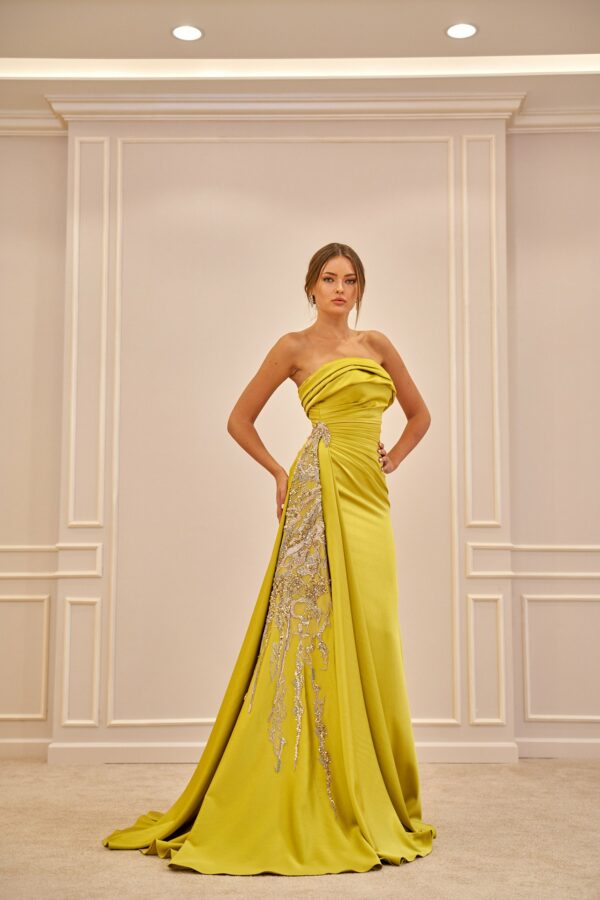 Shine in a custom Strapless Mermaid Gown With Hand Embroidered Side Drape crafted by a top Abu Dhabi designer. Schedule your private fitting now and stand out.