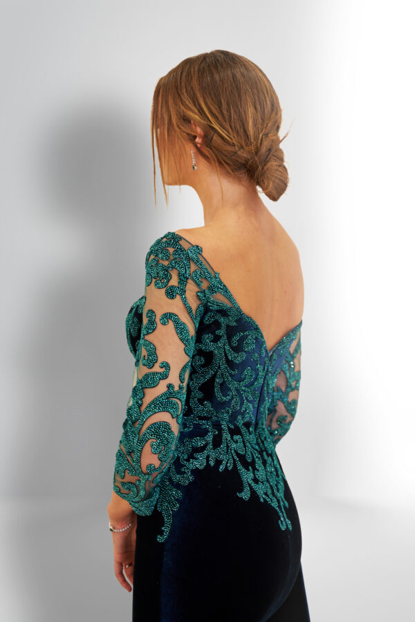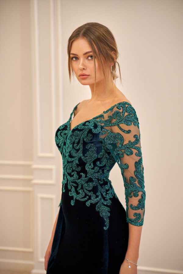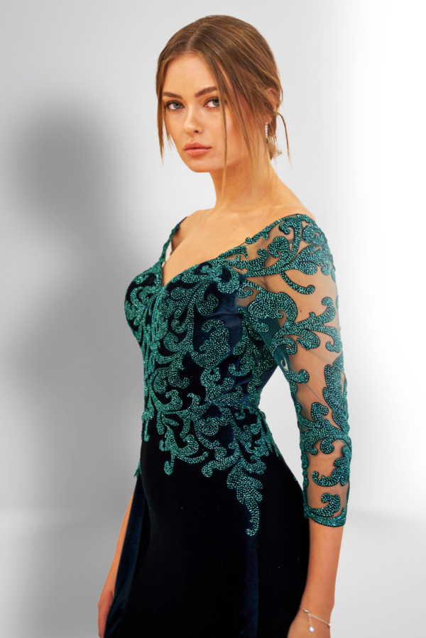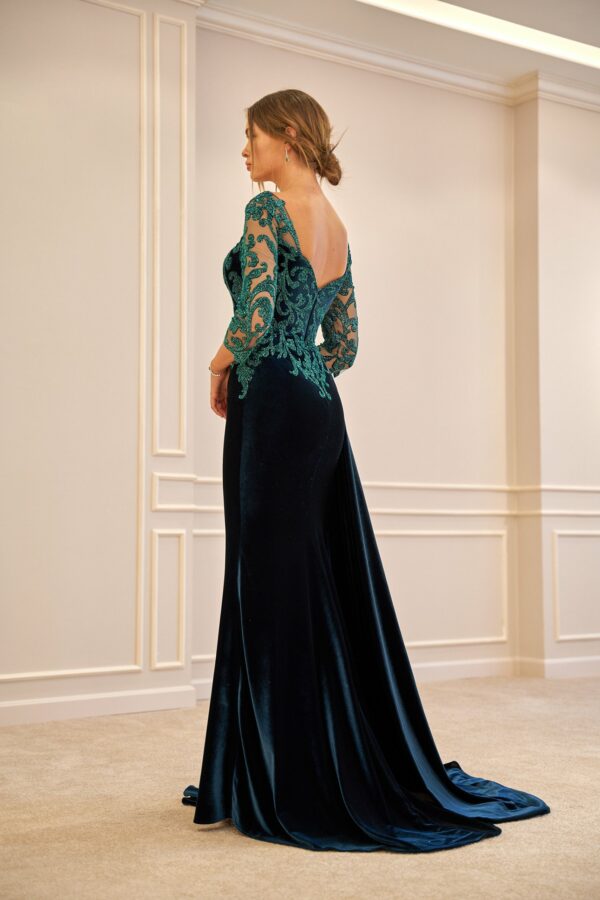 Own a stunning Velvet Lace Gown with Side Drape, custom-designed in Abu Dhabi. Book your design consultation today and create a look that’s uniquely yours.